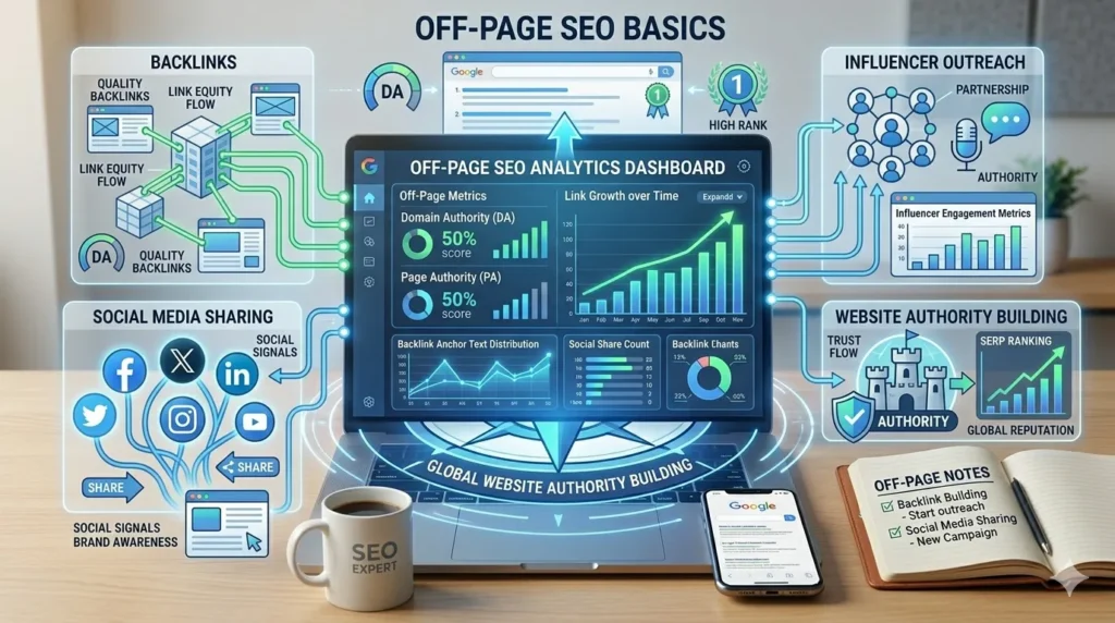Off page SEO basics include strategies like backlinks, social signals, and brand mentions that improve your website authority.